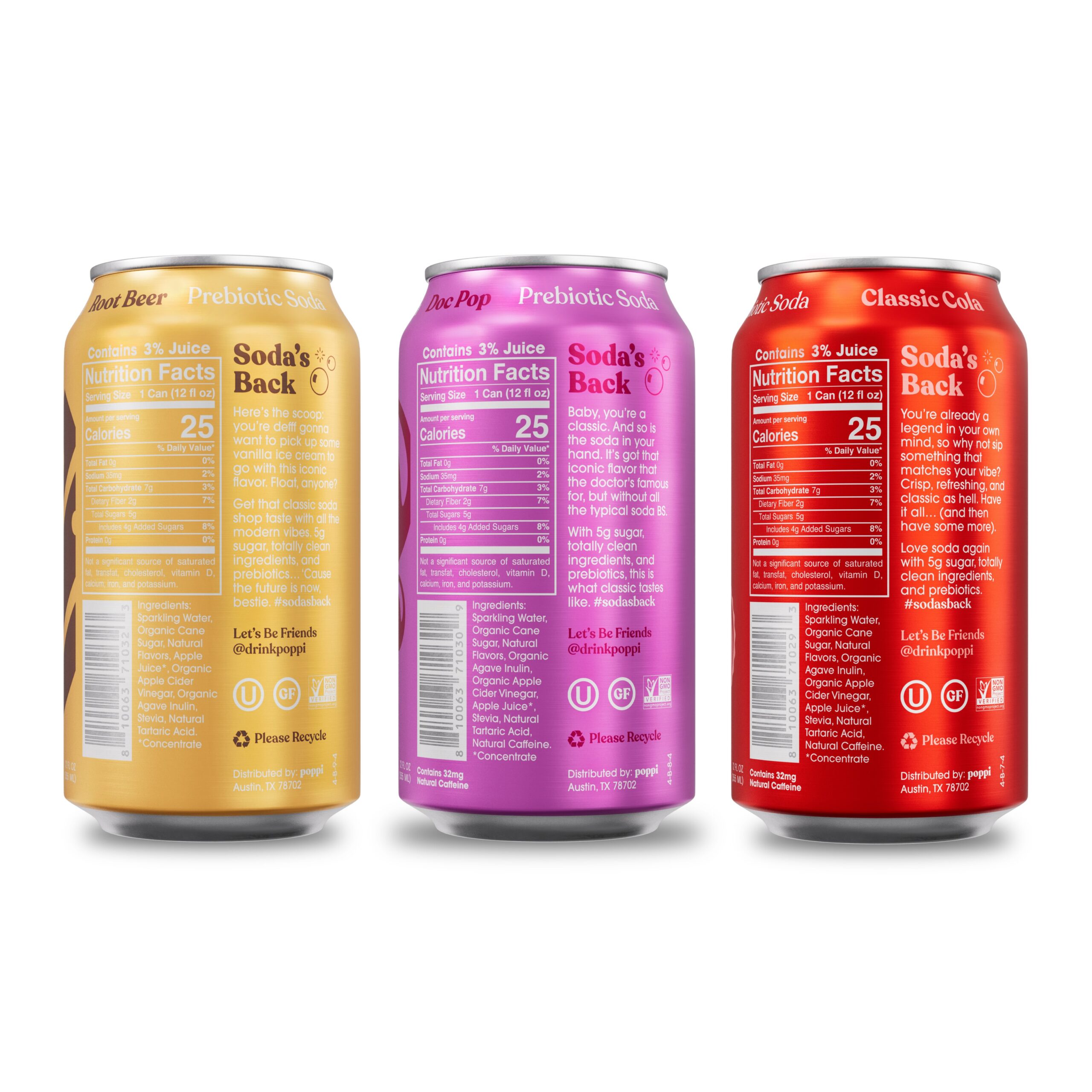 Pack Configuration: The pack contains (12) Poppi: 4 Root Beer cans, 4 Doc Pop cans (contains 32mg of natural caffeine)and 4 Classic Cola cans (Contains 32mg of natural caffeine).
